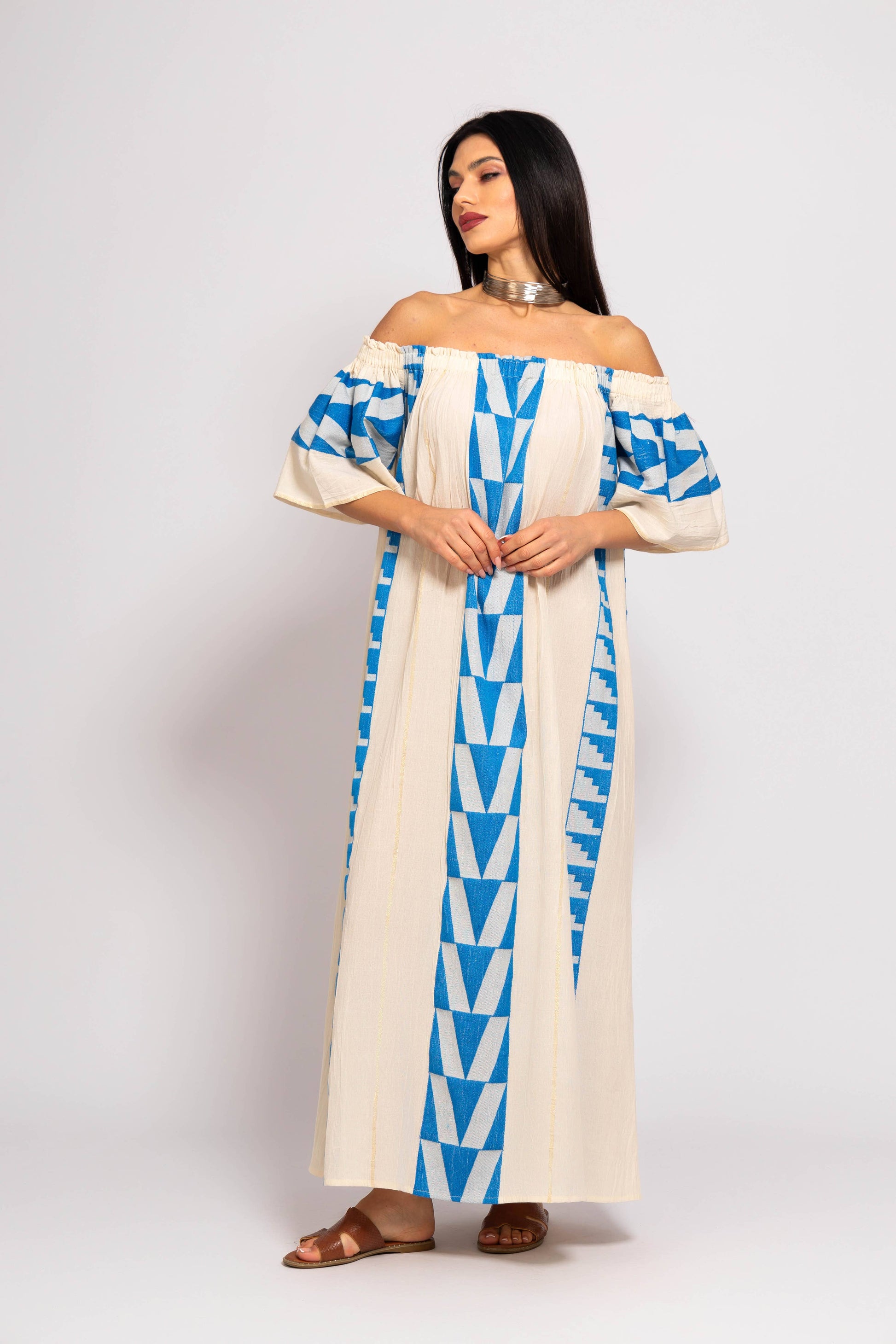 A woven dress with short sleeves, crafted from cotton jacquard fabric. Features an ancient Greek-inspired design, blending texture with timeless heritage. 🇬🇷 DESIGN IN GREECE